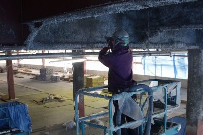 耐火被覆工事とは、万が一の火災発生時に備えた、国土交通省認定工事です。 鉄骨造の骨組み(梁・柱)を耐火性・断熱性の高い材料で被覆することで、火災の熱から守る建築基準法にも規定されている必要不可欠の工事です。